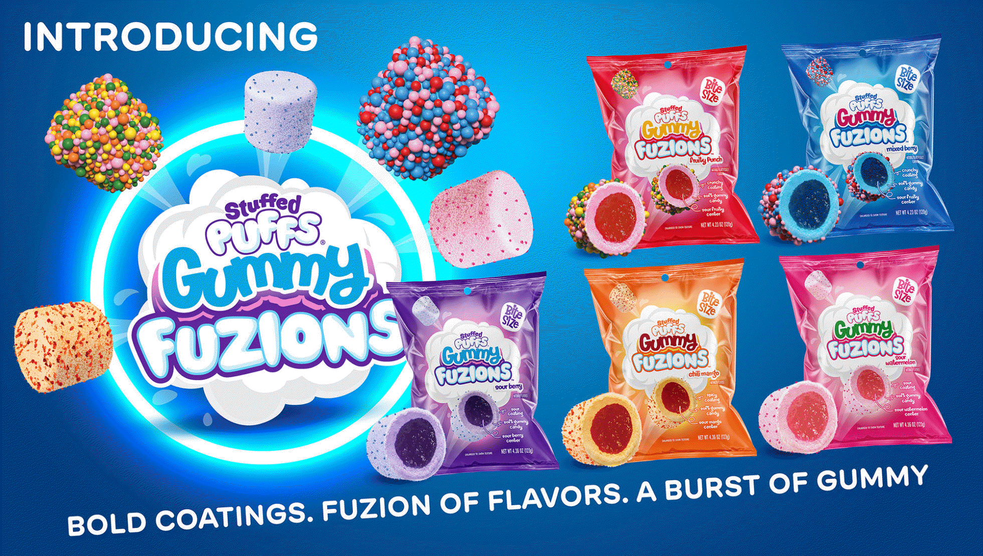 New Stuffed Puffs® Gummy Fuzions TM are bringing fun new textures to the gummy market. Gummy Fuzions TM bring coatings, fusions of flavor, and a burst of gummy in every piece. Sharing the same sweet-treat-with-a-surprise-center concept as the original Stuffed Puffs®, Gummy Fuzions TM start with a sour fruity center that is first covered in a soft gummy candy and then wrapped with either a crunchy or sour coating. Stuffed Puffs® Gummy Fuzions TM are available in five unique flavor and texture combinations in eight-count display ready cases and a 32-count shipper display.